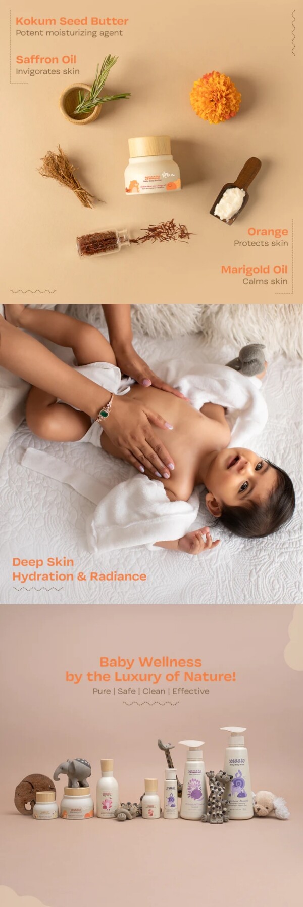 Aqua, Shea Butter (Butyrospermum Parkii), Cocoa Seed Butter (Theobroma Cacao), Cetyl Alcohol, Moringa Seed Oil, Kokum Seed Butter (Garcinia Indica), Coconut Oil (Cocos Nucifera), Olive Oil (Olea Europaea), Orange Oil (Citrus Aurantium Dulcis), Cetearyl Olivate (and) Sorbitan Olivate, Glyceryl Monostearate, Wheat Germ Oil (Triticum Vulgare), Coriander Extract (Coriandrum Sativum), Aloe vera Extract (Aloe Barbadensis), Glyceryl Caprylate, Saffron Oil, Vetiver Oil (Vetiveria Zizanoides), Marigold Oil, Sodium Gluconate, Rosemary Oil (Rosmarinus officinalis), Xanthan Gum, Potassium Carbonate