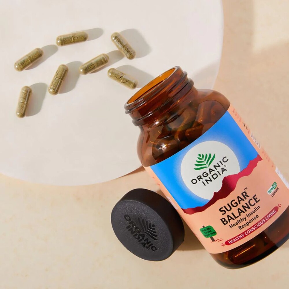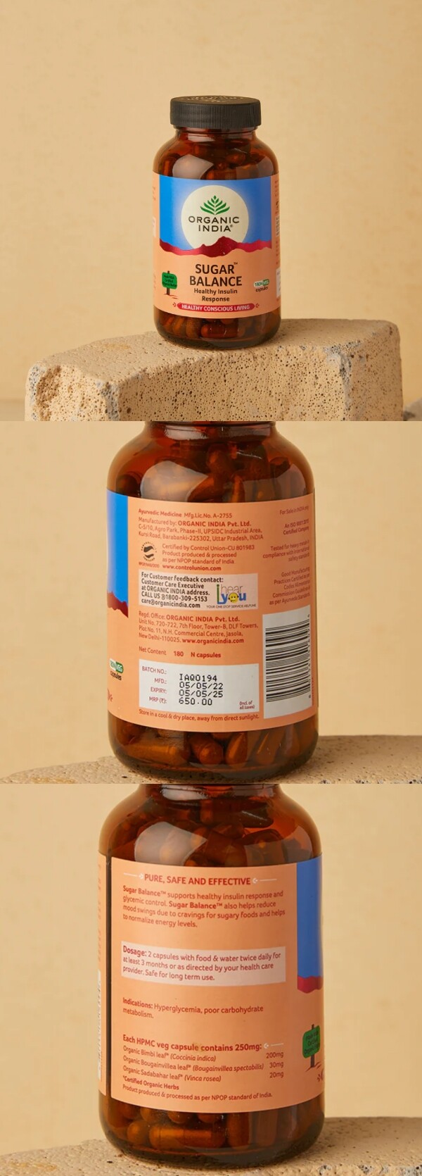 Each Sugar Balance HPMC veg capsule contains 250mg:Organic Bimbi leaf* (Coccinia indica) , Organic Bougainvillea leaf* (Bougainvillea spectabilis) , Organic Sadabahar leaf* (Vinca rosea)