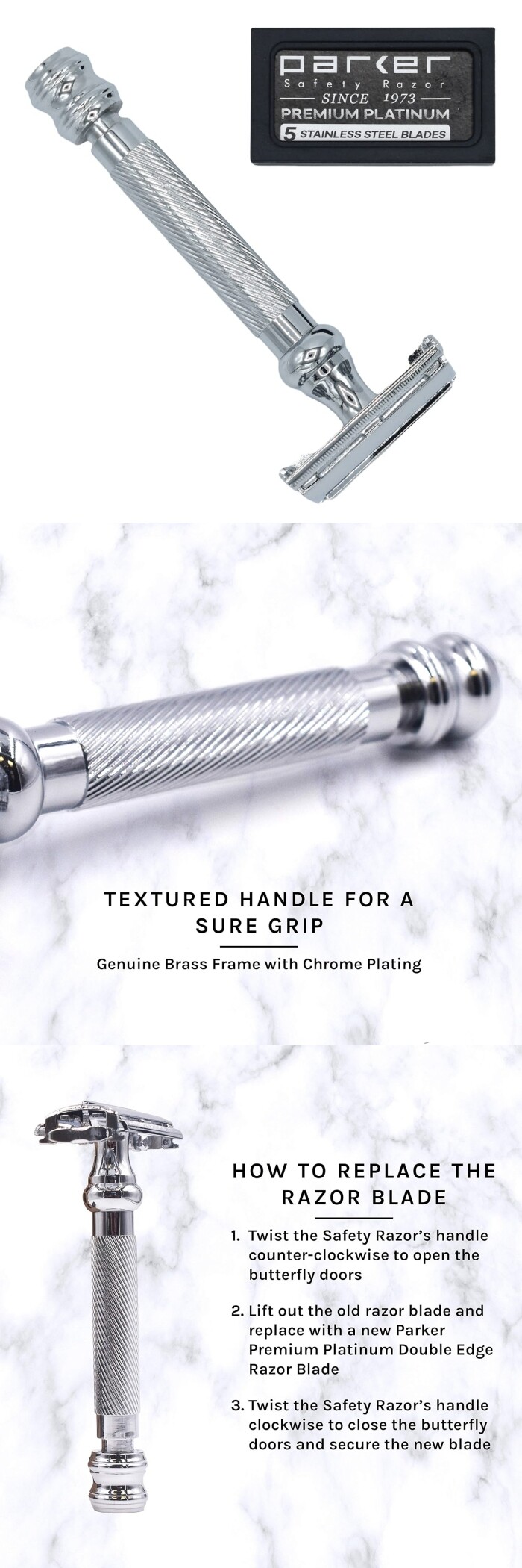 [Parker Safety Razor Long Handle Heavyweight Butterfly Open Razors and 5 Platinum Double Edge Blades]